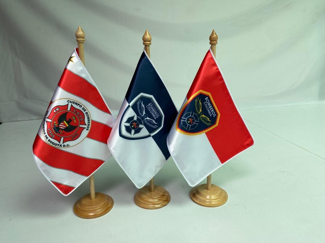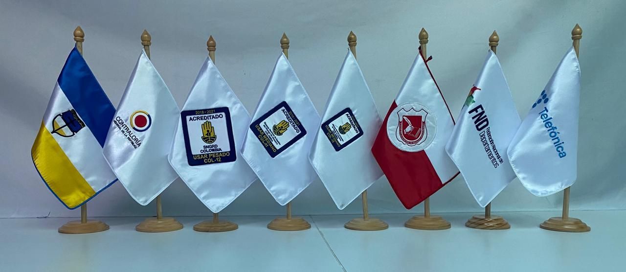 Presentamos nuestras banderas de escritorio en satín fino, ideales para oficinas, recepciones, salas de reuniones y actos institucionales. Bordado a una cara. Tela de satín fino de alta calidad